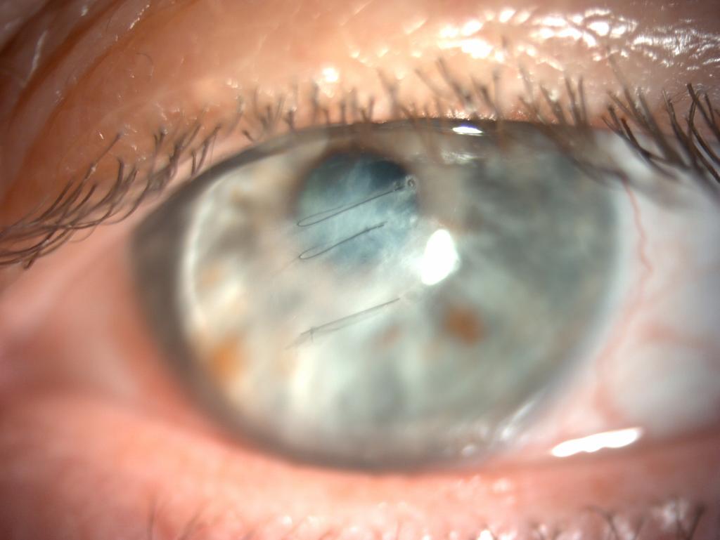 Die Klinik führte eine operative Versorgung durch: Es wurden Murraine-Nähte gelegt und eine Gastamponade in die Vorderkammer eingebracht. Ziel dieser Maßnahme ist es, den Riss in der Descemet-Membran zu stabilisieren und die Hornhaut zum Abschwellen zu bringen.