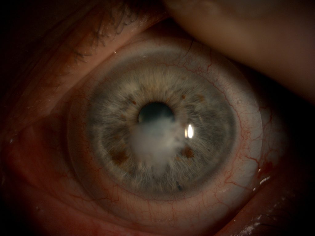 Februar 2026 – Ein Jahr nach der Operation: Die Hornhaut ist weitgehend klar. Restnarben sind sichtbar, aber die optische Zone ist funktional.