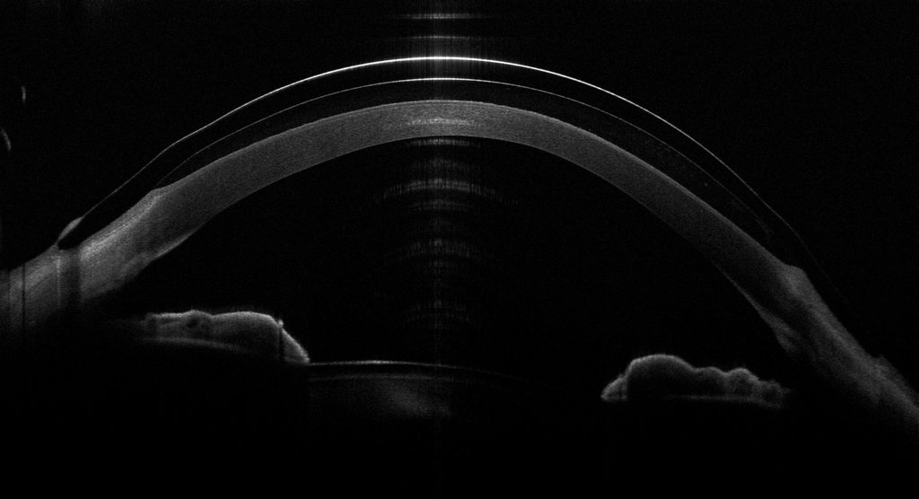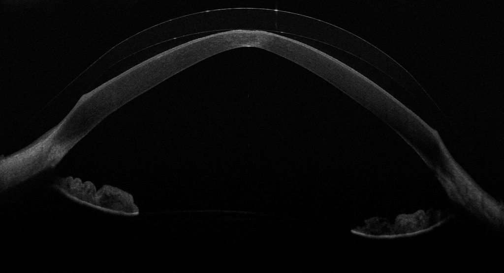 In dieser OCT-Aufnahme sehen Sie eine Sklerallinse mit ausreichender Clearance. Der obere Bogen ist die Linse, der untere die Hornhaut. Der schwarze Raum dazwischen ist das Tränenreservoir – gut gefüllt, gleichmäßig verteilt. So soll es aussehen.
